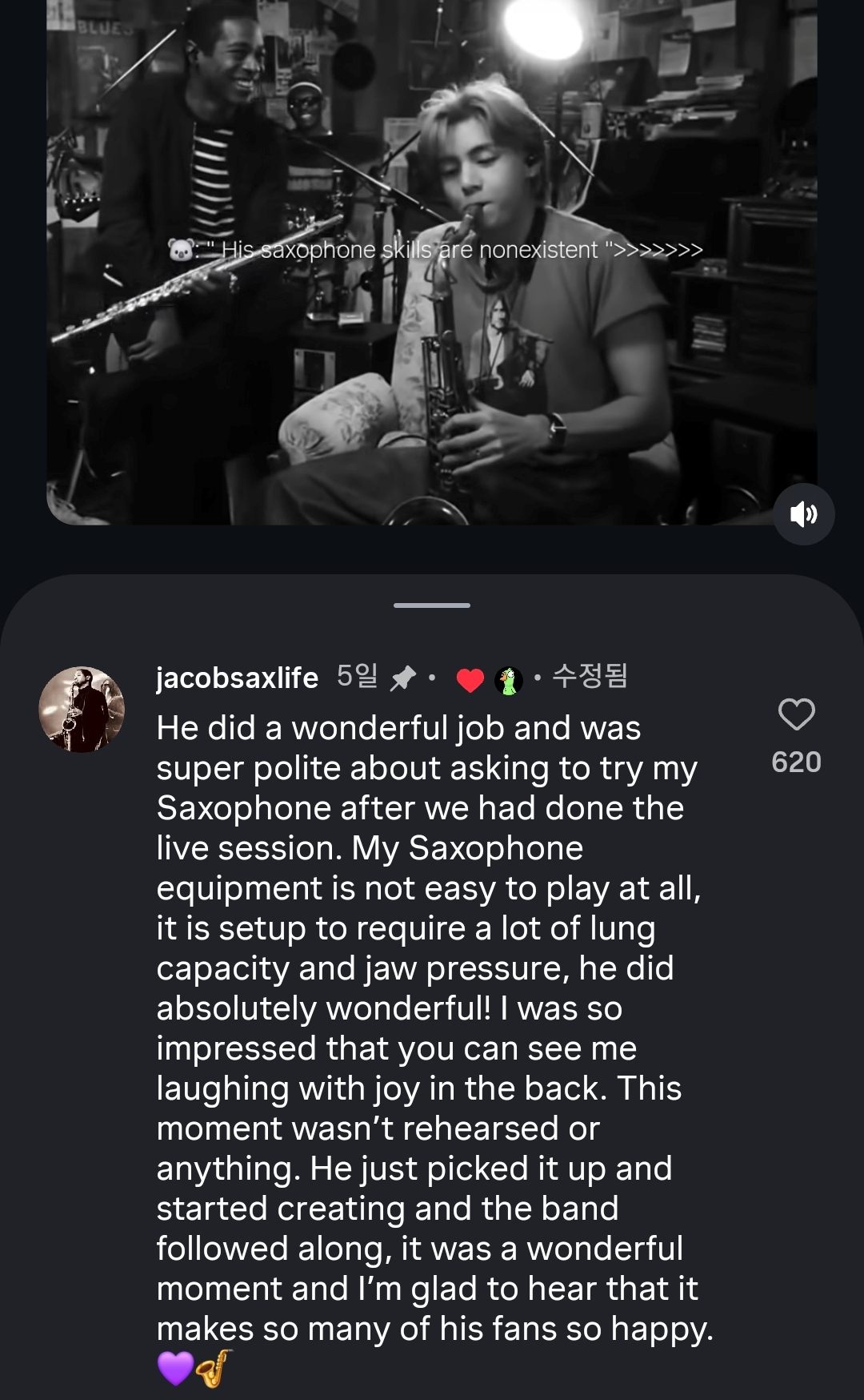 - 그래미상 수상자이자 세계적인 색소포니스트 제이콥 스케스니가 뷔의 색소폰 연주 영상에 찬사의 글을 남겼다. 그는 마룬 5, 조나스 브라더스, 숀 멘데스, 존 레전드 등과 수많은 히트곡을 협업한 연주자로, 뷔의 솔로 앨범 Layover 작업에도 참여했다. 뷔가 2023년 9월 'Tiny Desk Korea 스페셜 편'에 출연해 라이브 공연을 선보였을 때 스케스니도 밴드 연주자로 함께했다. 공연 직후 그는 자신의 인스타그램 프로필을 'Tae-Band 뮤지션'으로 바꿨으며, "언제든 나의 색소폰을 연주해도 좋다"는 글을 남겨 뷔에게 애정을 드러냈다. 2026년 4월, 스케스니는 한 팬이 올린 뷔의 색소폰 연주 영상에 당시를 추억하는 글을 남겼다. "뷔는 정말 훌륭하게 연주했고, 라이브 세션이 끝난 뒤, 내 색소폰을 한번 연주해 봐도 되겠냐고 아주 정중하게 물어봤다. 내 색소폰은 사실 연주하기가 매우 어렵다. 폐활량이 많이 필요하고, 턱의 압력도 많이 줘야 하도록 세팅이 되어 있었다. 그런데도 그는 정말 놀라울 정도로 잘 연주했다! 내가 너무 감동해서 뒤에서 웃고 있는 모습이 보일 것이다. 저 순간은 리허설을 한 것이 아니고, 전혀 준비된 것도 아니었다. 뷔가 그냥 색소폰을 집어 들고 연주를 하기 시작했고, 밴드도 자연스럽게 따라서 연주했다. 정말 멋진 순간이었고, 그 장면이 팬들을 매우 행복하게 했다는 말을 들으니 기쁘다." 뷔의 색소폰 즉흥 연주 영상 Tiny Desk Korea 라이브 영상