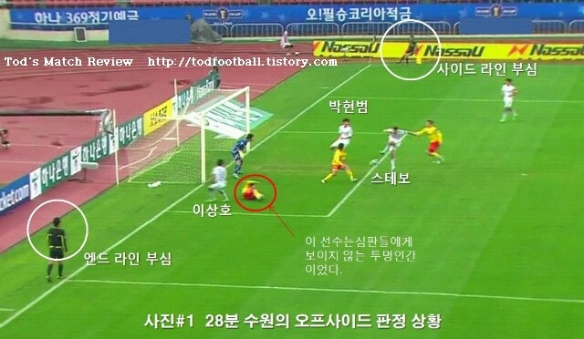 특히, 한국은 3,4위전 터키전에서 안정환이 득점을 하였으나 이천수가 오프사이드라인에 있어서 득점이 오프사이드로 득점 인정을 못 받았다.[14] 이경규가 간다에서는 애매한 각도에서의 먼거리 영상을 리플레이로 보여주며 크로스를 할 때 공이 골라인 밖에서 안으로 휘어 들어왔다며 정당한 판정이라고 했지만, 다른 리플레이 영상으로 보면 공이 안 넘어갔다는 걸 확인할 수 있다.[15] 참고로 오프사이드 룰은 패스를 받는 시점이 아니라 패스가 가는 시점이 기준이다. 상대 진영에서 패스가 가는 시점에 우리 편 공격수의 위치에 따라 오프사이드가 선언되는 것이다.[16] 그리고 피케는 16강 러시아전에서도 모로코전과 같은 행동을 했다가 제대로 걸리는 바람에 팀 패배의 원흉이 되었다.[17] VAR 판독과 오프사이드 분석 결과[18] 사실 이것도 엄청 순화해서 번역한 것이며 Bullshit은 지랄한다, X같다는 의미로 쓰이는 단어라 그냥 대놓고 카메라에 쌍욕을 박아버린 것이다.[19] 이 경기에서 벌어진 상황이랑 다른 유형이지만 앞서 E조 2차전 브라질 vs 코스타리카에서 비디오 판독 끝에 브라질의 페널티킥이 취소된 사례가 있었다. 이후 16강전 스위스 vs 스웨덴 경기 막판에도 미하엘 랑이 득점 기회를 갖고 있는 상대 선수를 페널티 박스 근처에서 밀어서 페널티킥을 내줬는데 이 역시 파울이 애매한 위치에서 벌어졌기 때문에 비디오 판독으로 올라갔다. 그 결과 스웨덴의 프리킥으로 번복되었고 미하엘 랑의 퇴장은 유지되었다.[20] 당시 포르투갈은 1975년 이후 41년 간 프랑스를 이기지 못하는 징크스가 있었다.[21] 충돌이라고 말하기도 부끄러울 정도로 거의 스치듯이 지나갔다.[22] 이전에 손흥민의 다이빙 논란에 완고히 손흥민이 다이빙이 맞다고 주장한 바 있다.[23] 개리 네빌과 마찬가지로 손흥민 다이빙에 관해 발언한 것도 있고, 살라, 마네가 다이버라고 실랄하게 깠던 이력이 있다.[24] 16강 조별리그[25] 당시 홈 앤 어웨이 방식으로 진행했다.[26] 훗날 카잔의 기적에서 김영권의 결승골이 온사이드인 것과 같다. 김영권이 볼을 받기 전에 마지막으로 볼을 건드린 선수가 우리 선수가 아니라 독일의 토니 크로스였고, 이것이 단순 굴절이 아니라 크로스가 공을 소유한 뒤 패스/클리어링을 시도하던 상황이었기 때문이다.[27] 그리고 더 큰 논란이 된 것은 이 경기 전날 울산-상주전에서 배정됐던 최명용(주심)-이민후(대기심) 심판이 역할을 바꿔 다음날 전남-서울전에 출전했던 것. 시간 텀을 두고 다른 경기에 역할을 바꿔 배정되는 경우는 있지만 바로 다음날 경기에 투입되는 경우는 없다. 더군다나 당시 상황은 전남, 울산, 서울이 상위 스플릿 진출을 두고 치열하게 경쟁중이었던 때였다. 이것 때문에 언론은 리그 스폰서과 관련된 울산 밀어주기 아니냐는 의혹을 제기했고 팬들은 울산 밀어주기와 더불어 2014 시즌 유달리 오심의 수혜를 많이 입은 서울 밀어주기 아니냐는 의혹을 제기했다. 그리고 이 사건의 주역인 최명용-이민후는 1년 후 심판 매수 사건에 연루되었다.[28] 가관인 건 이 심판이 2010 대한축구협회 최우수주심, 2013 FA컵 최우수주심에 선정될 만큼 능력을 인정받은 베테랑이라는 점.[29] 주심은 공을 보느라 보지 못했고 부심 또한 선수들에게 가려서 놓친 것으로 보인다.[30] 게임이 1, 2차전 모두 치열해 묻힌감이 크다.[31] 연맹 입장에선 심판 징계했단 뉴스 내보내봐야 안 좋기 때문에 모양새라도 좋게 이런 식으로 서류 없는 징계들을 내리고 있다.또한 저 강등 조치가 생각보다 큰 징계인 것이, 당장 봉급은 물론이요 심판들이 경기 진행할 때마다 받는 돈이 있는데 그 돈이 꽤 날아간다.[32] 최소한 온필드 리뷰라도 했었다면 논란이 더 커지지는 않았을 것이다.[33] 20경기를 치렀는데 인정된 오심이 나온 경기만 7경기, 즉 35% 나 되며 이 중 승패와 직결된 오심은 3경기 정도라고 한다. 다만 전문가들의 평가는 7경기 이상이라는 듯. 사실상 절반이상의 경기에서 오심이 나왔을 가능성도 있다.[34] 그렇다고 후반기에 인정된 오심이 없던 건 아니며, 3승 이상이 오심으로 날아갔기에 수원이 본 손해는 이만저만이 아니다. 무엇보다 아시아 챔피언스리그 티켓을 날려먹었다.[35] 경기 당시에는 윤종규의 키킹 파울을 선언했으나, 경기 후 설영우의 푸싱 파울로 정정됐다. 즉 파울의 주체가 완전히 뒤바뀐 오심을 저지른 셈이다.[36] 공교롭게도 나상호가 그 이후부터 폼이 개판이 되었다.[37] 고명석의 두 번째 골은 별 문제 없었으나 온필드 리뷰로 시간을 무지하게 잡아먹었고, 경기 중 양 팀간 싸움이 있었는데도 카드조차 꺼내지 않았다.[38] 이미 주심이 휘슬을 불어서 판정을 내린 상황이였기에, VAR을 통해 확인하는 것이 불가능했다.[39] 이 오심으로 파이널 A 기회를 잡은 팀은[40] 오심이 아니었다면 강원은 승점 32점으로 수원FC와 수원(모두 승점 33점)에 밀려 강등당했을 것이다.[41] 그나마 이쪽은 승강 플레이오프에서 극적으로 잔류라도 했기에 망정이지 수원은...[42] 덕분에 발디비아는 패배팀 선수임에도 라운드 MVP에 선정되는 희대의 주인공이 되었다.[43] 심지어 이 골을 넣은 선수는 다름 아닌 이호재다. 다만
