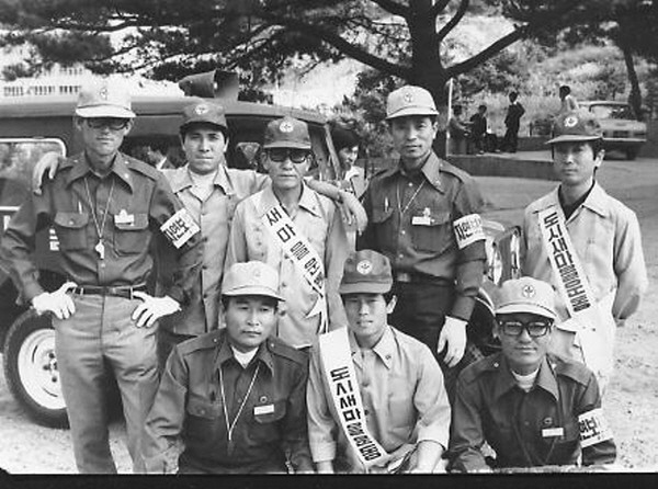 새마을복을 입고 태풍 매미 피해를 보고받는 노무현 대통령. 문재인 민정수석과 문희상 대통령비서실장, 김두관 행정자치부장관, 기타 수행하는 공무원들이 착용한 갈색 제복은 2005년 개편 이전의 민방위복이다.